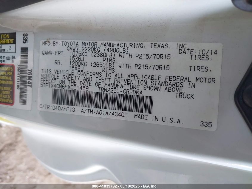 Color WhiteCylinders 4Drive UnknownVIN 5TFTX4CN6FX******State Run & Drive VerifiedDamage Back AutoRIA