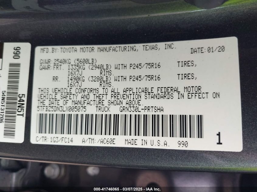 2020 TOYOTA TACOMA 2020 Gasoline, 3.5, Unknown, VIN - 5TFBZ5DN3LX****** from the USA