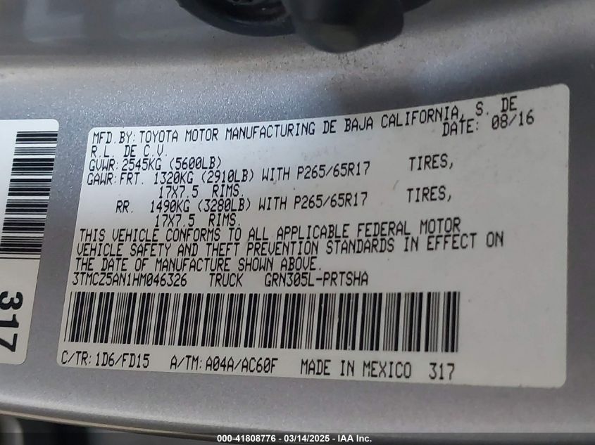 2017 TOYOTA TACOMA 2017 Gasoline, 3.5, Full drive, VIN - 3TMCZ5AN1HM****** from the USA