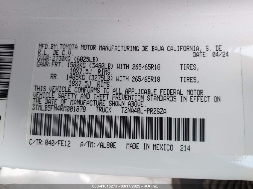 2024 TOYOTA TACOMA 2024 Gasoline, 2.4, Unknown, VIN - 3TMLB5FN4RM****** from the USA
