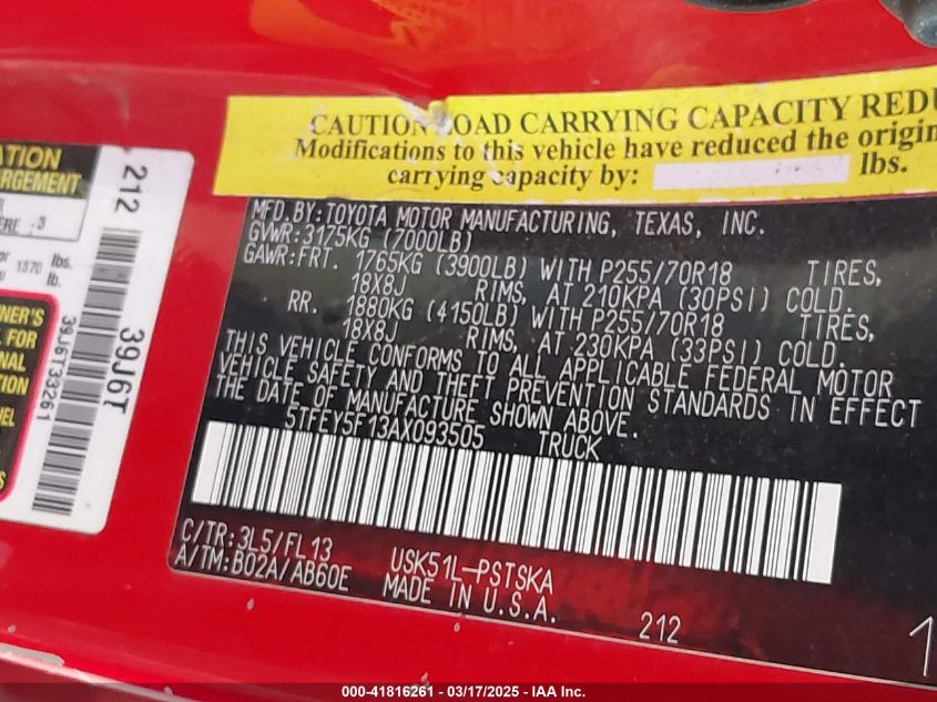Color RedCylinders 8Drive UnknownVIN 5TFEY5F13AX******State Run & Drive VerifiedDamage Front or backAuction date 2025-03-26 AutoRIA