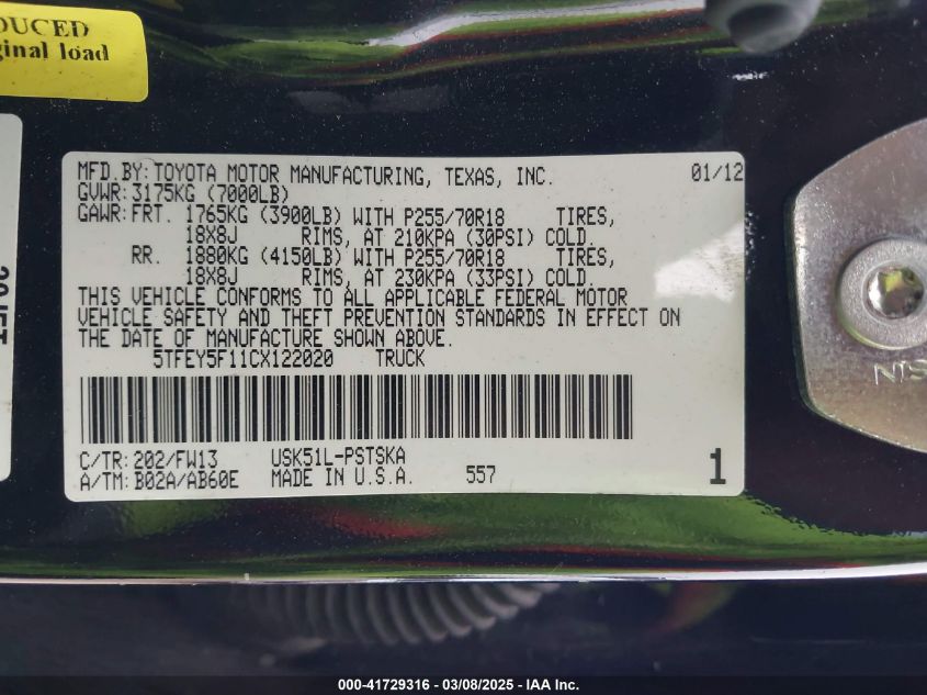 2012 TOYOTA TUNDRA 2012 Gasoline, 5.7, Unknown, VIN - 5TFEY5F11CX****** from the USA