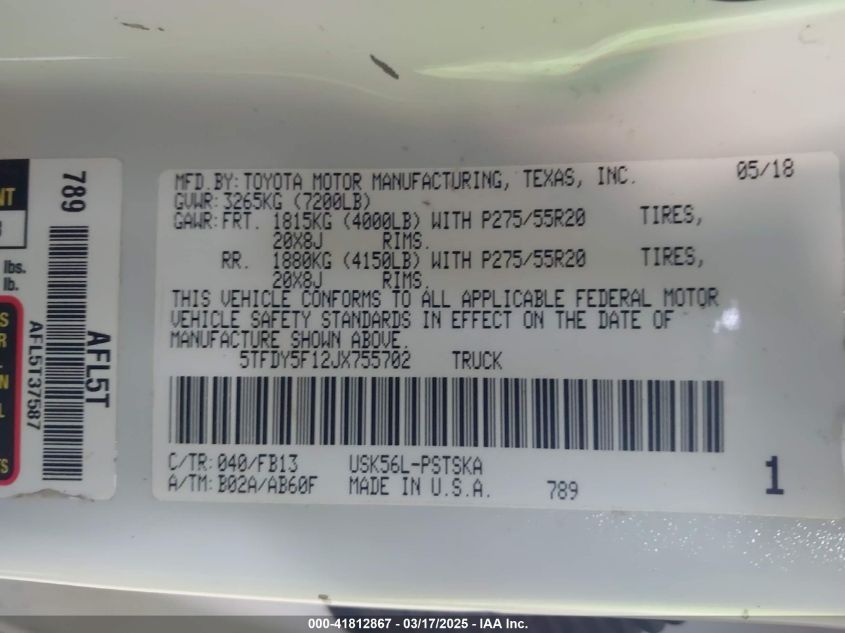 2018 TOYOTA TUNDRA 2018 Gasoline, 5.7, Full drive, VIN - 5TFDY5F12JX****** from the USA