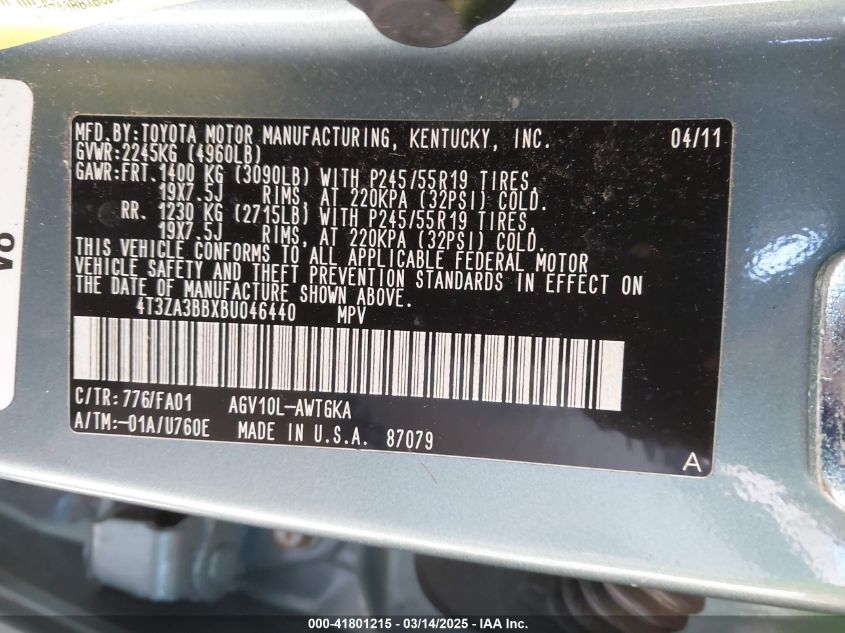 Color BlueCylinders 4Drive Front wheel driveVIN 4T3ZA3BBXBU******State Run & Drive VerifiedDamage Front and backAuction date 2025-03-25 AutoRIA