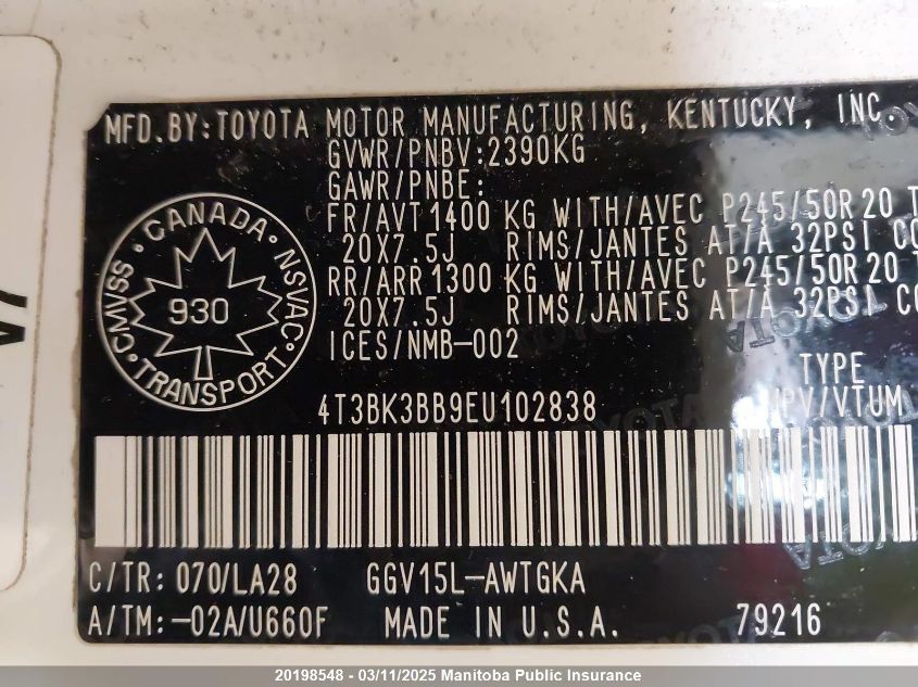 Color WhiteCylinders 6Drive UnknownVIN 4T3BK3BB9EU******State Run & Drive VerifiedDamage FrontAuction date 2025-03-26 AutoRIA