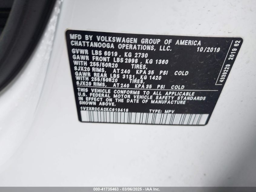 2019 VOLKSWAGEN ATLAS 2019 Gasoline, 3.6, Full drive, VIN - 1V2XR2CA2KC****** from the USA