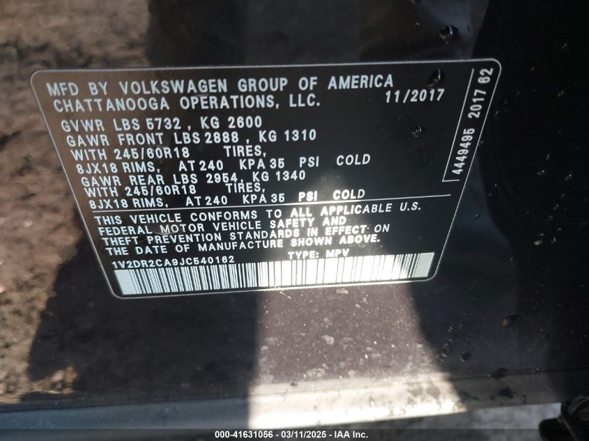 2018 VOLKSWAGEN ATLAS 2018 Gasoline, 3.6, Front wheel drive, VIN - 1V2DR2CA9JC****** from the USA