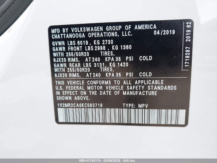 2019 VOLKSWAGEN ATLAS 2019 Gasoline, 3.6, Full drive, VIN - 1V2MR2CA0KC****** from the USA