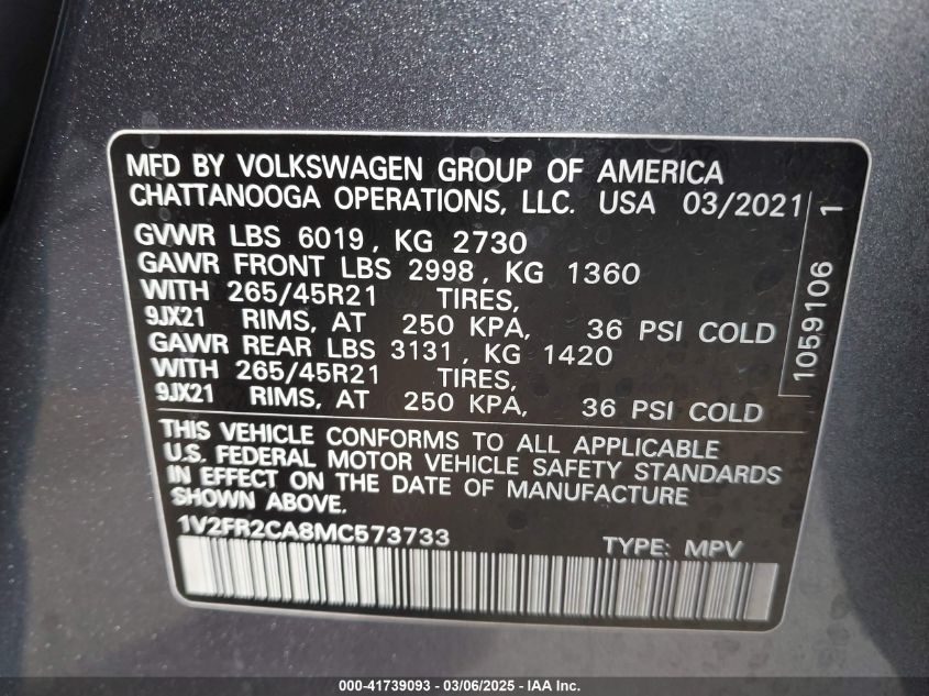 2021 VOLKSWAGEN ATLAS 2021 Gasoline, 3.6, Full drive, VIN - 1V2FR2CA8MC****** from the USA