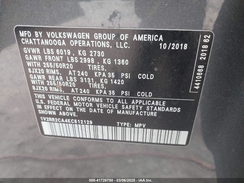 2019 VOLKSWAGEN ATLAS 2019 Gasoline, 3.6, Full drive, VIN - 1V2RR2CA4KC****** from the USA