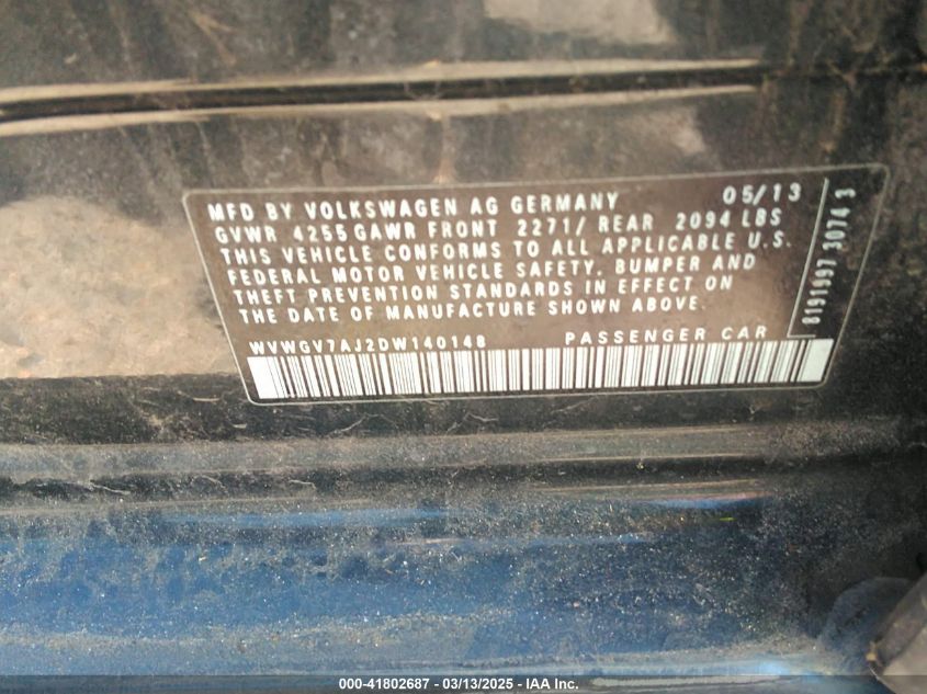 Color BlackCylinders 4Drive Front wheel driveVIN WVWGV7AJ2DW******State Run & Drive VerifiedDamage Front or backAuction date 2025-03-25 AutoRIA