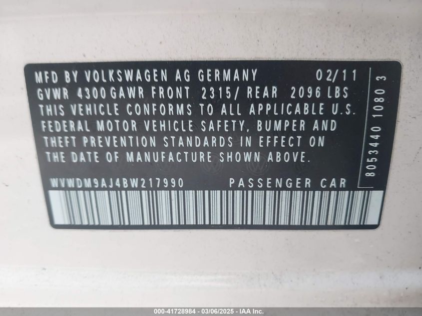 Color WhiteCylinders 4Drive Front wheel driveVIN WVWDM9AJ4BW******State Run & Drive VerifiedDamage Front left AutoRIA