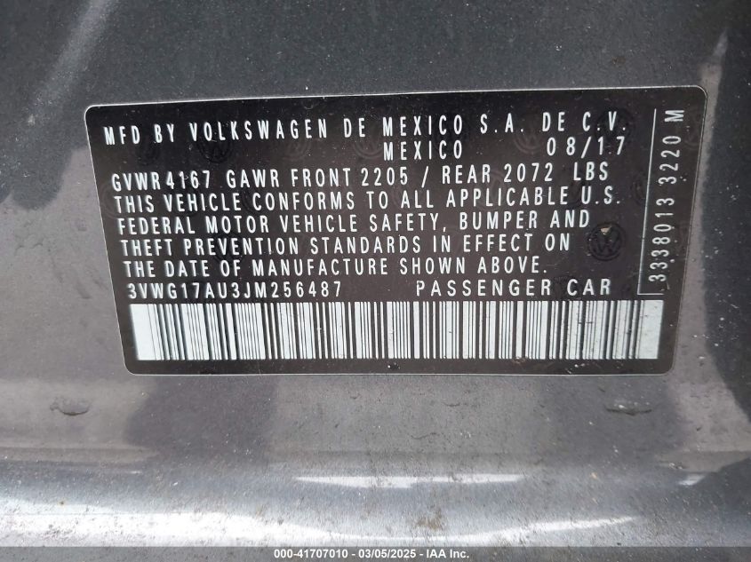 Color GrayCylinders 4Drive Front wheel driveVIN 3VWG17AU3JM******State Run & Drive VerifiedDamage Front or backAuction date 2025-03-24 AutoRIA
