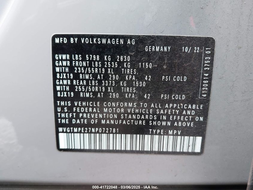 2022 VOLKSWAGEN ID.4 2022 Electric, , Unknown, VIN - WVGTMPE27NP****** from the USA
