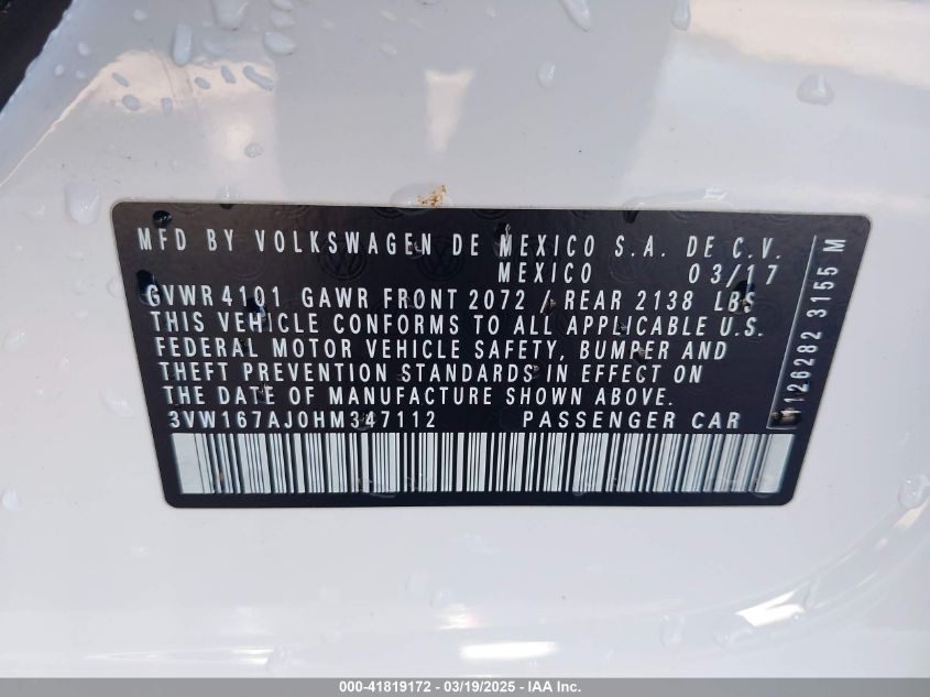 2017 VOLKSWAGEN JETTA 2017 Gasoline, 1.4, Front wheel drive, VIN - 3VW167AJ0HM****** from the USA