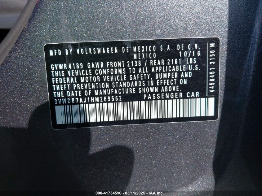 2017 VOLKSWAGEN JETTA 2017 Gasoline, 1.4, Front wheel drive, VIN - 3VWDB7AJ1HM****** from the USA
