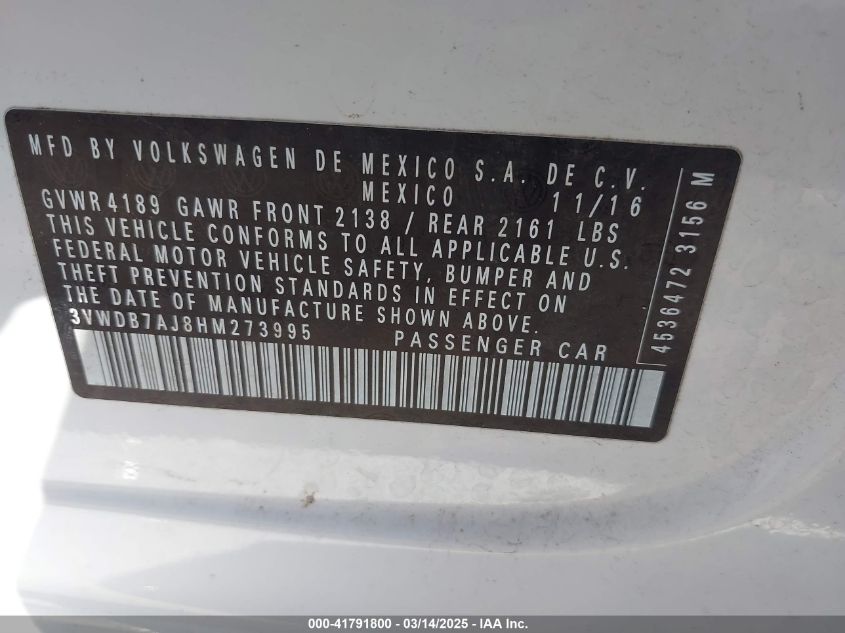 2017 VOLKSWAGEN JETTA 2017 Gasoline, 1.4, Front wheel drive, VIN - 3VWDB7AJ8HM****** from the USA