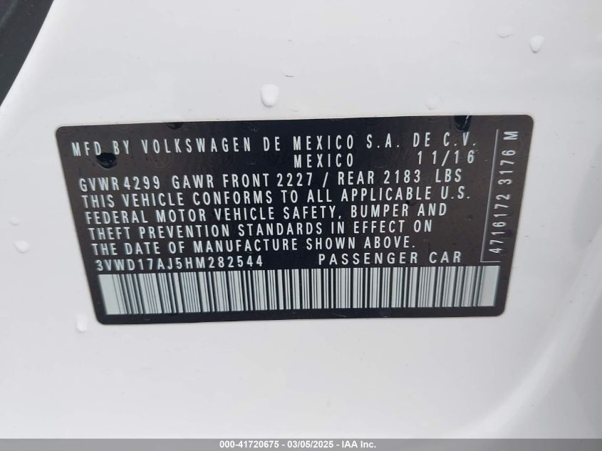 Color WhiteCylinders 4Drive Front wheel driveVIN 3VWD17AJ5HM******State Run & Drive VerifiedDamage Rear rightAuction date 2025-03-25 AutoRIA