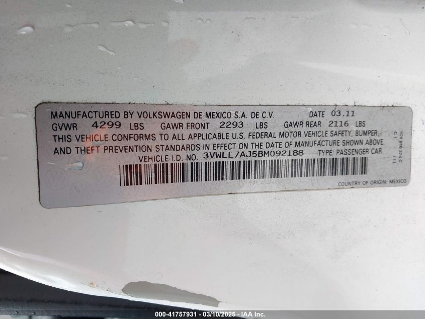 Color WhiteCylinders 4Drive Front wheel driveVIN 3VWLL7AJ5BM******State Run & Drive VerifiedDamage Left sideAuction date 2025-03-20 AutoRIA