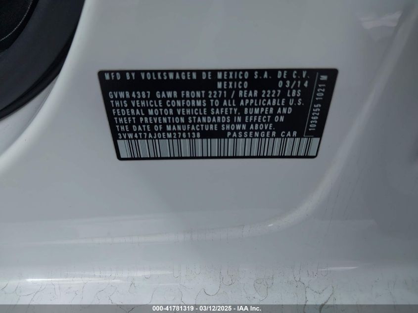 2014 VOLKSWAGEN JETTA 2014 Gasoline, 2.0, Front wheel drive, VIN - 3VW4T7AJ0EM****** from the USA