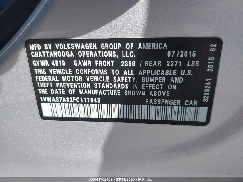 2015 VOLKSWAGEN PASSAT 2015 Gasoline, 1.8, Front wheel drive, VIN - 1VWAS7A32FC****** from the USA