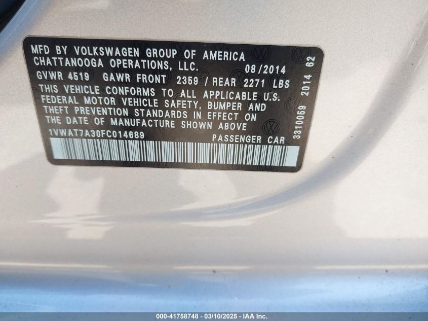 2015 VOLKSWAGEN PASSAT 2015 Gasoline, 1.8, Front wheel drive, VIN - 1VWAT7A30FC****** from the USA