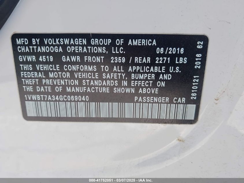 2016 VOLKSWAGEN PASSAT 2016 Gasoline, 1.8, Front wheel drive, VIN - 1VWBT7A34GC****** from the USA