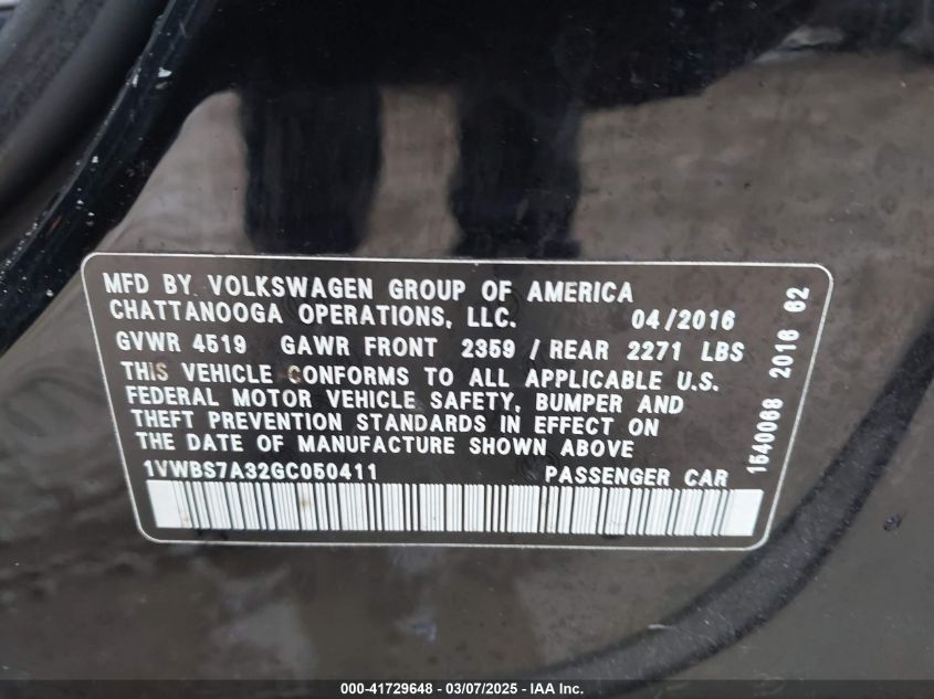 2016 VOLKSWAGEN PASSAT 2016 Gasoline, 1.8, Front wheel drive, VIN - 1VWBS7A32GC****** from the USA