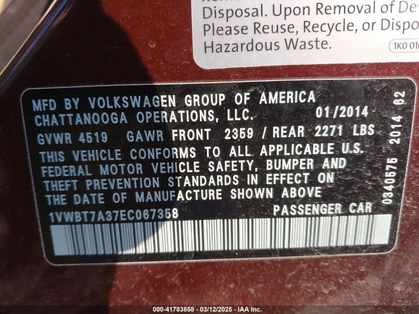 2014 VOLKSWAGEN PASSAT 2014 Gasoline, 1.8, Front wheel drive, VIN - 1VWBT7A37EC****** from the USA