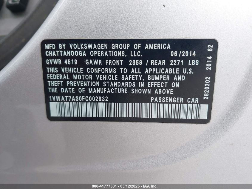 2015 VOLKSWAGEN PASSAT 2015 Gasoline, 1.8, Front wheel drive, VIN - 1VWAT7A30FC****** from the USA