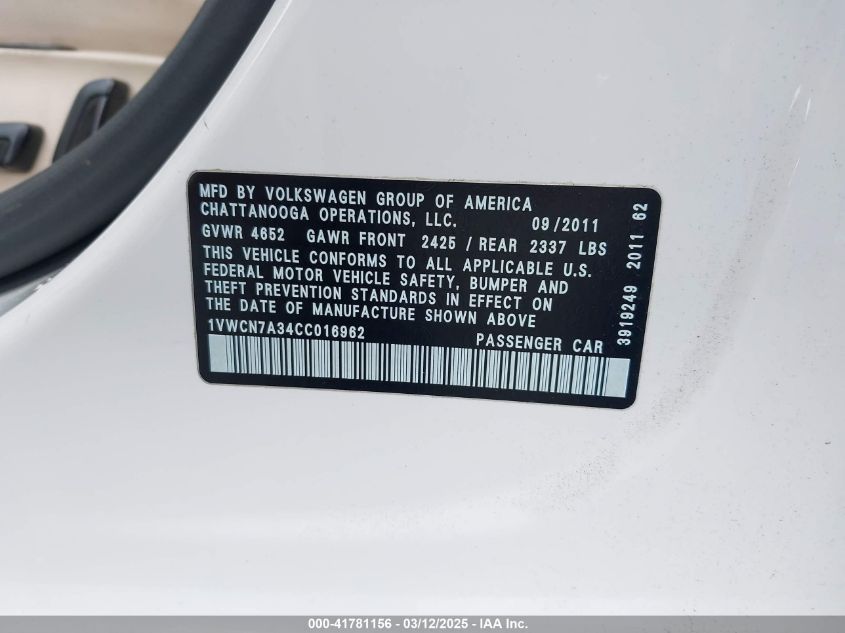 Color WhiteCylinders 4Drive Front wheel driveVIN 1VWCN7A34CC******State Run & Drive VerifiedDamage Insignificant AutoRIA
