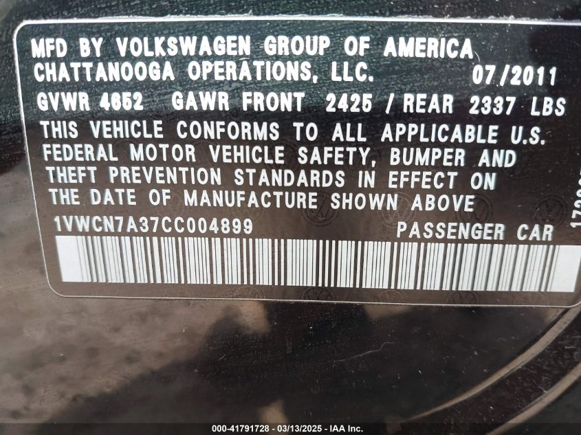 2012 VOLKSWAGEN PASSAT 2012 Diesel, 2.0, Front wheel drive, VIN - 1VWCN7A37CC****** from the USA