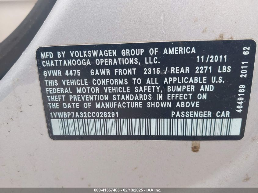 2012 VOLKSWAGEN PASSAT 2012 Gasoline, 2.5, Front wheel drive, VIN - 1VWBP7A32CC****** from the USA