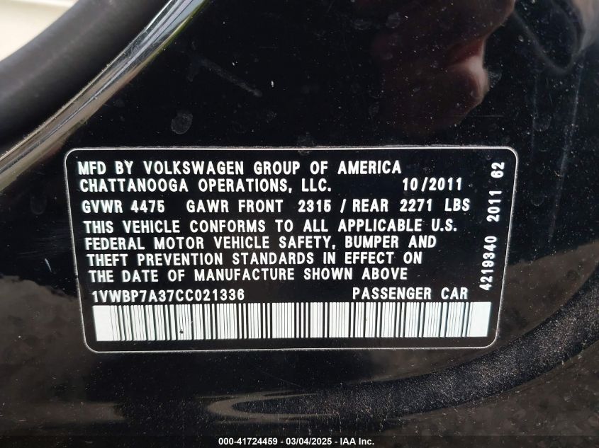2012 VOLKSWAGEN PASSAT 2012 Gasoline, 2.5, Front wheel drive, VIN - 1VWBP7A37CC****** from the USA
