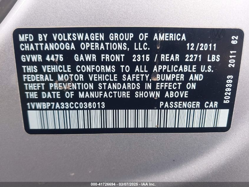 Color SilverCylinders 5Drive Front wheel driveVIN 1VWBP7A33CC******State Run & Drive VerifiedDamage Front or back AutoRIA