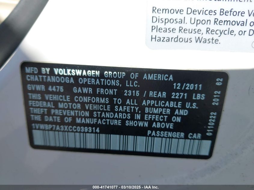 2012 VOLKSWAGEN PASSAT 2012 Gasoline, 2.5, Front wheel drive, VIN - 1VWBP7A3XCC****** from the USA