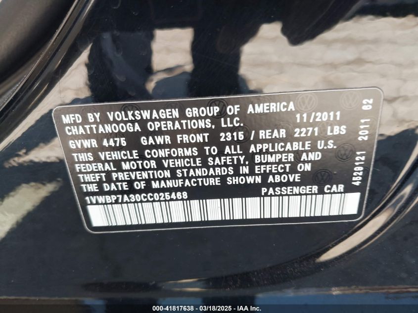 2012 VOLKSWAGEN PASSAT 2012 Gasoline, 2.5, Front wheel drive, VIN - 1VWBP7A30CC****** from the USA