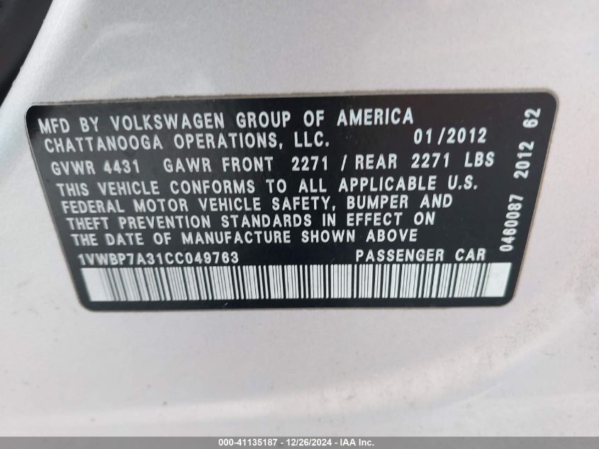 2012 VOLKSWAGEN PASSAT 2012 Gasoline, 2.5, Front wheel drive, VIN - 1VWBP7A31CC****** from the USA