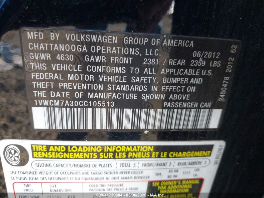 Color BlackCylinders 6Drive Front wheel driveVIN 1VWCM7A30CC******State Run & Drive VerifiedDamage Back AutoRIA