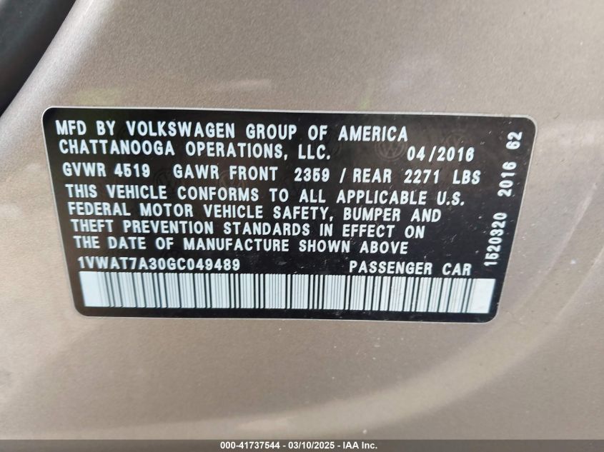 2016 VOLKSWAGEN PASSAT 2016 Gasoline, 1.8, Front wheel drive, VIN - 1VWAT7A30GC****** from the USA