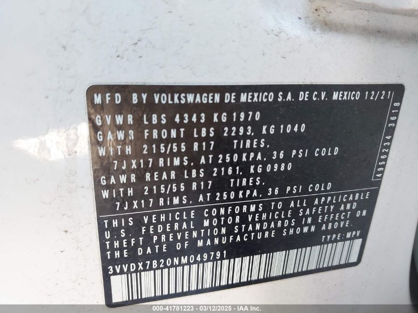 Color WhiteCylinders 4Drive Front wheel driveVIN 3VVDX7B20NM******State Run & Drive VerifiedDamage Right sideAuction date 2025-03-21 AutoRIA
