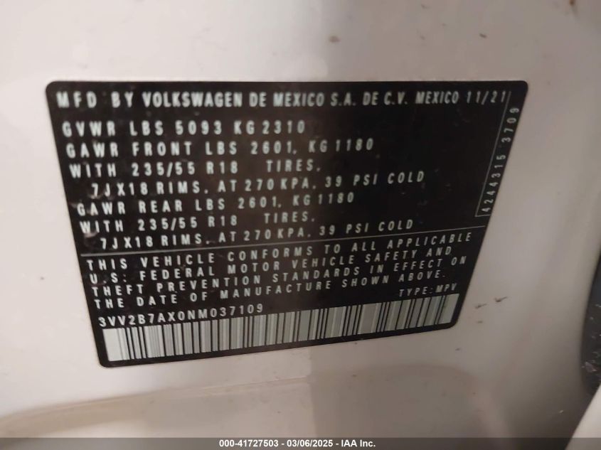 2022 VOLKSWAGEN TIGUAN 2022 Gasoline, 2.0, Full drive, VIN - 3VV2B7AX0NM****** from the USA