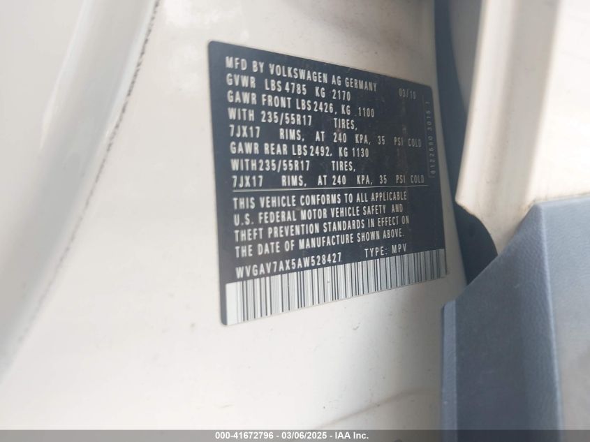 2010 VOLKSWAGEN TIGUAN 2010 Gasoline, 2.0, Front wheel drive, VIN - WVGAV7AX5AW****** from the USA