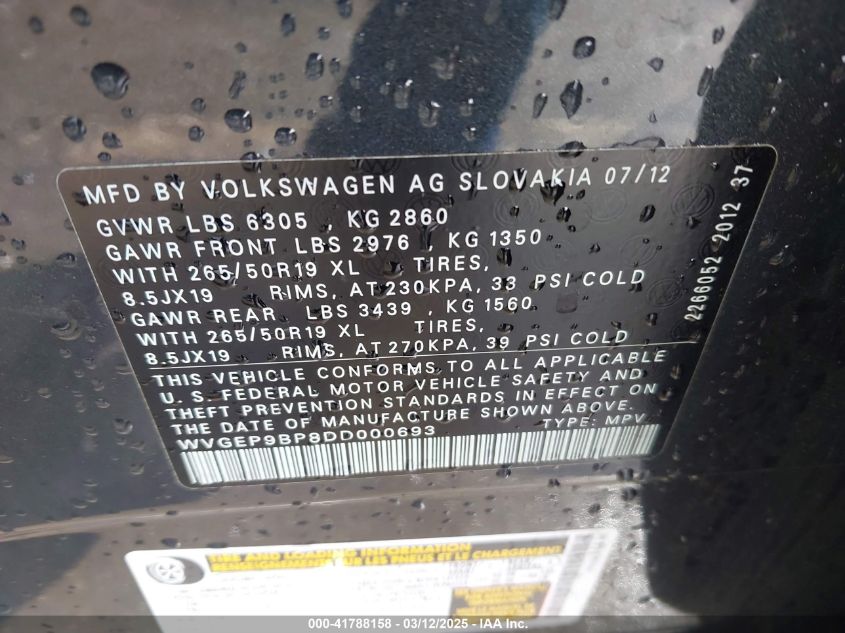 Color BlackCylinders 6Drive Full driveVIN WVGEP9BP8DD******State Run & Drive VerifiedDamage Front or backAuction date 2025-03-26 AutoRIA