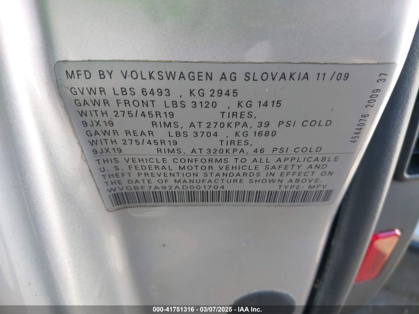 2010 VOLKSWAGEN TOUAREG 2010 Gasoline, 3.6, Full drive, VIN - WVGBF7A92AD****** from the USA