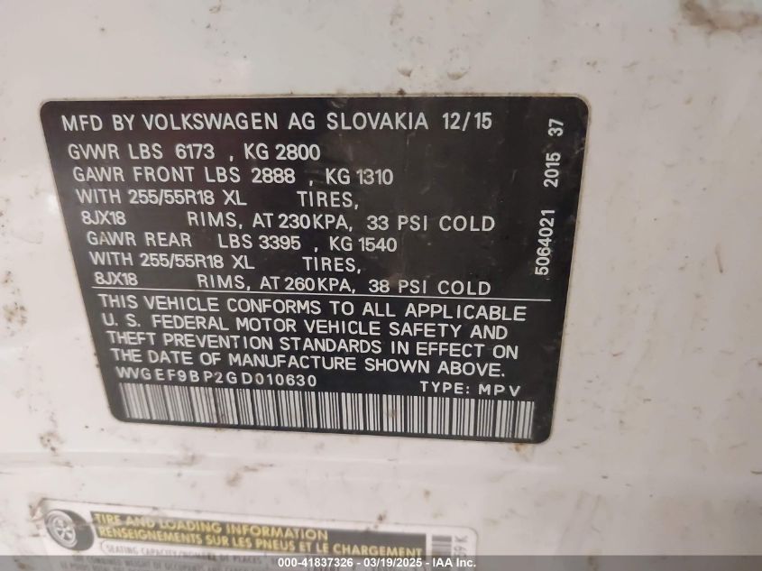 Color WhiteCylinders 6Drive Full driveVIN WVGEF9BP2GD******State Run & Drive VerifiedDamage Front or back AutoRIA