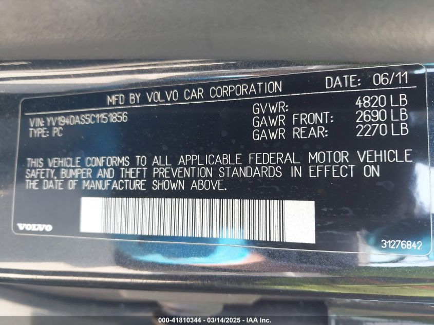 Color GrayCylinders 6Drive Front wheel driveVIN YV1940AS5C1******State Run & Drive VerifiedDamage Back AutoRIA