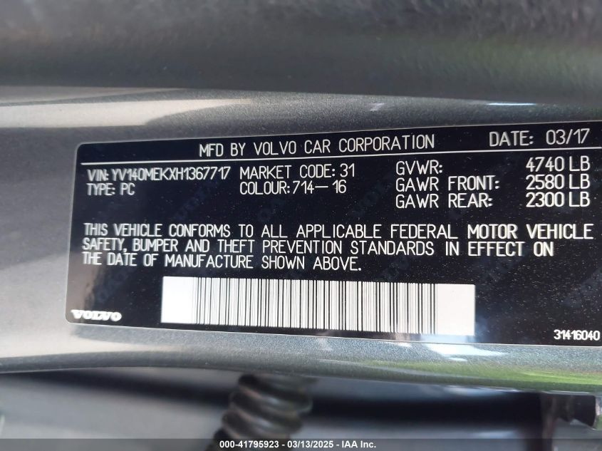 Color GrayCylinders 4Drive Front wheel driveVIN YV140MEKXH1******State Run & Drive VerifiedDamage Right sideAuction date 2025-03-26 AutoRIA