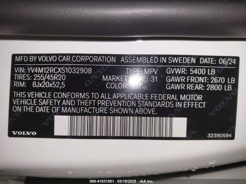 Color WhiteCylinders 4Drive Full driveVIN YV4M12RCXS1******State Run & Drive VerifiedDamage Right side