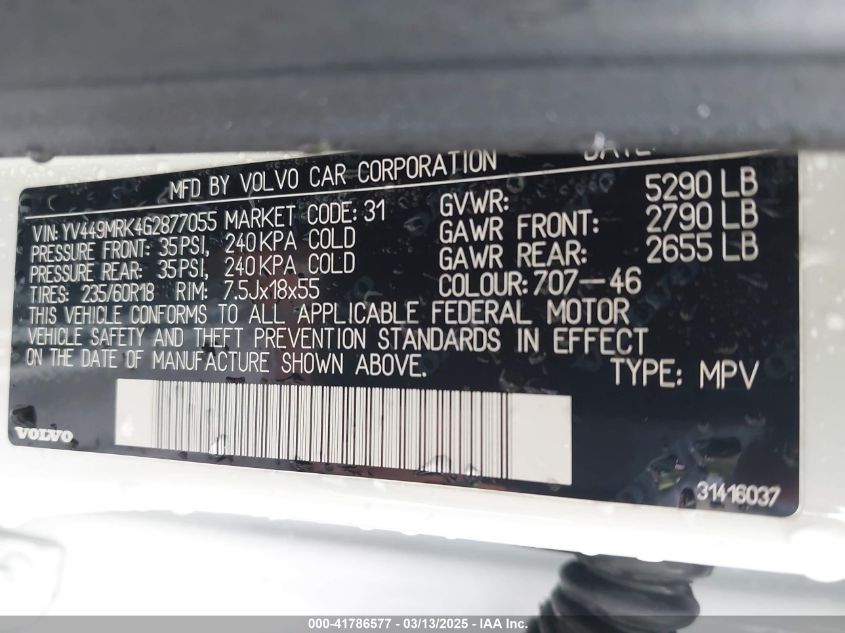 Color WhiteCylinders 4Drive Full driveVIN YV449MRK4G2******State Run & Drive VerifiedDamage Right side AutoRIA